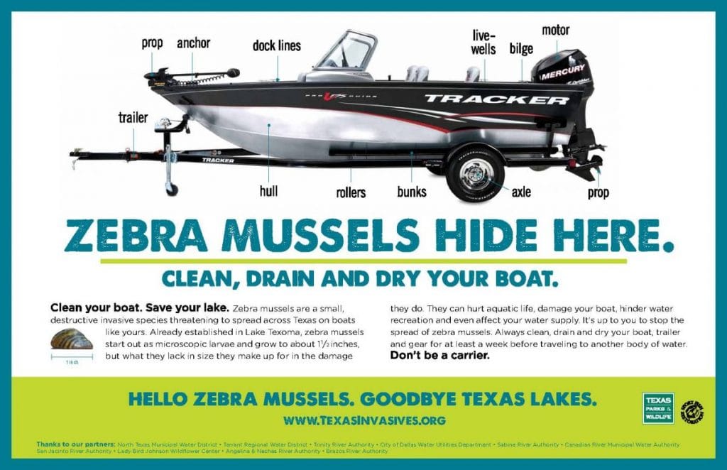 Zebra mussels are a highly invasive freshwater species that can have a devastating impact on the environment and the economy. Zebra mussels spread from one body of water to the next by boaters and fishermen who don't properly clean, drain and dry their watercraft, minnow buckets, or other equipment.